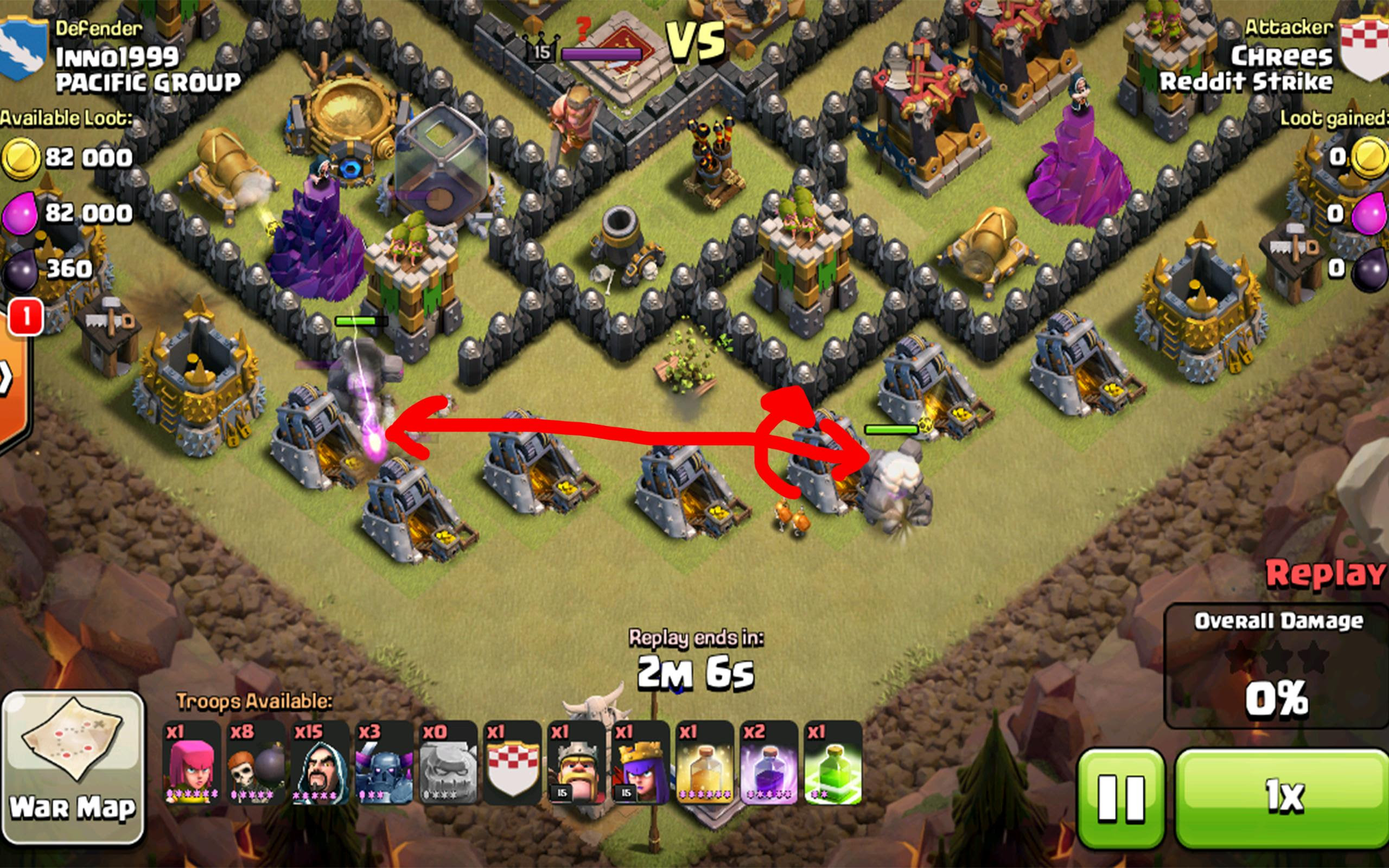 either side of the golem. These left a line of structures in the direction I wanted the troops to go. Right after that shot, I dropped the pekkas, as the